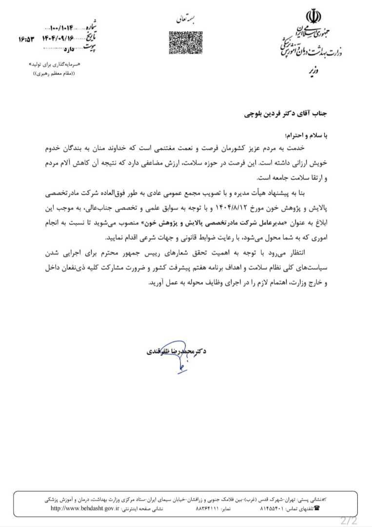 دکتر ظفرقندی، وزیر بهداشت در حکمی دکتر فردین بلوچی را به عنوان مدیرعامل شرکت مادر تخصصی پالایش و پژوهش خون منصوب کرد.